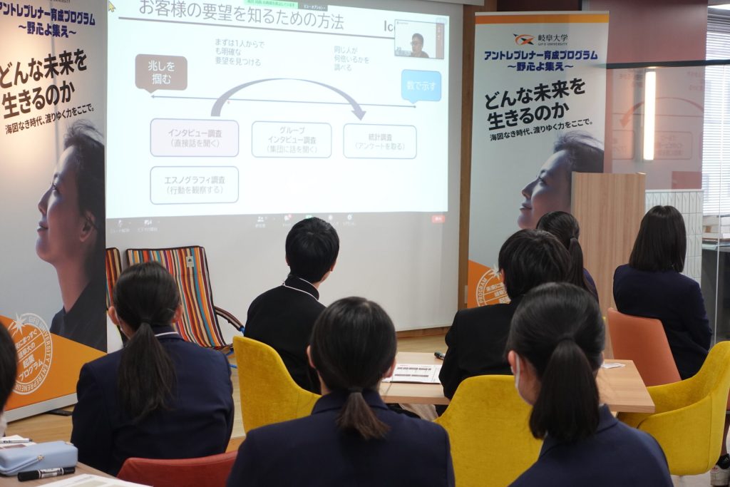 河西様には、独自のプログラム「岐阜大学アントレプレナー育成プログラム」の講座を1dayで実施いただきました。河西様はオンラインで講義をし、学生はオンラインとオフラインのハイブリッドで25名の学生が参加し様々なワークを交えながら講義を受けました。多くのワークを取り入れた実践型の講義で、起業へのはじめの一歩を踏み出してもらうことが狙いでした。