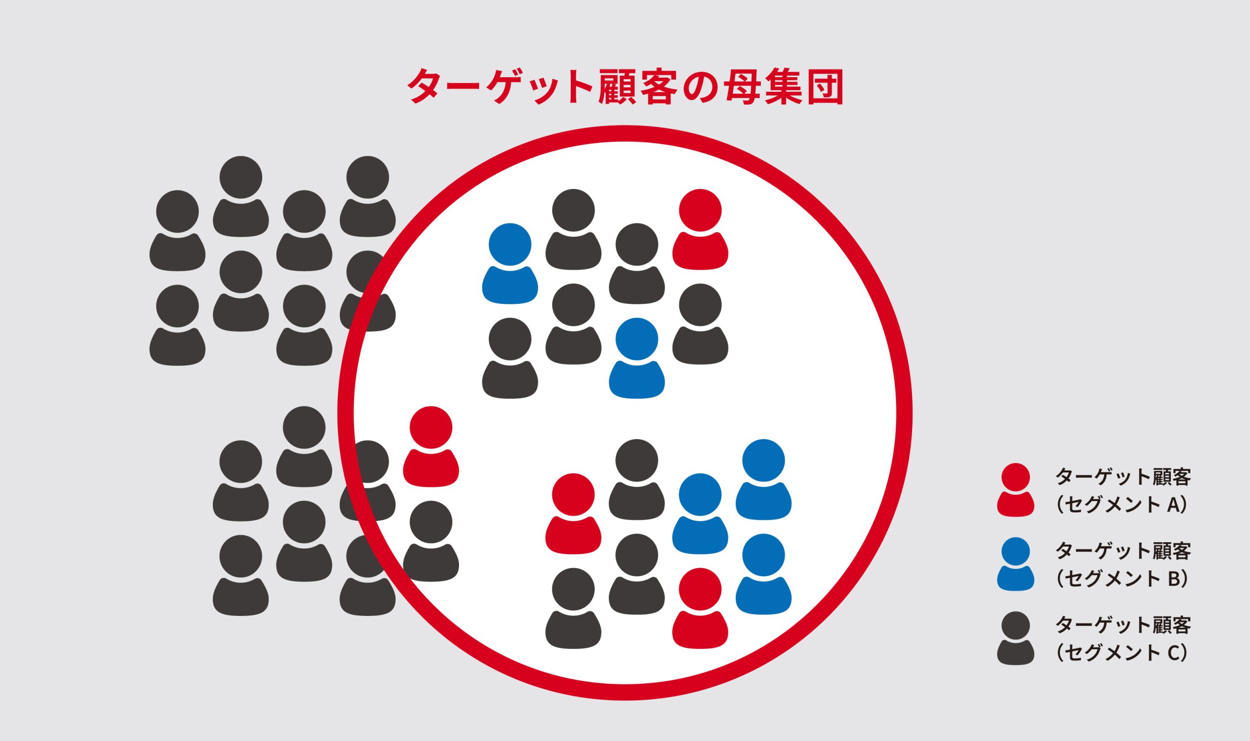 しかし、すでに私たちの製品を活用いただいているお客様というお立場の方からの意見を集約し、それを事業所の数だけでも17万以上※ある製造業の代表意見として取り扱うことは果たして公平と言えるのでしょうか。今回のプロジェクトで私たちが意識したのは、狙うべき顧客の中に存在する、異なる属性の複数の方から均等に意見を抽出することでした。以下の図で言えば、ターゲット顧客の母集団(赤枠内)の中にいる赤、青、黒それぞれの属性を持つ方からバランスよくお話を伺うイメージです。