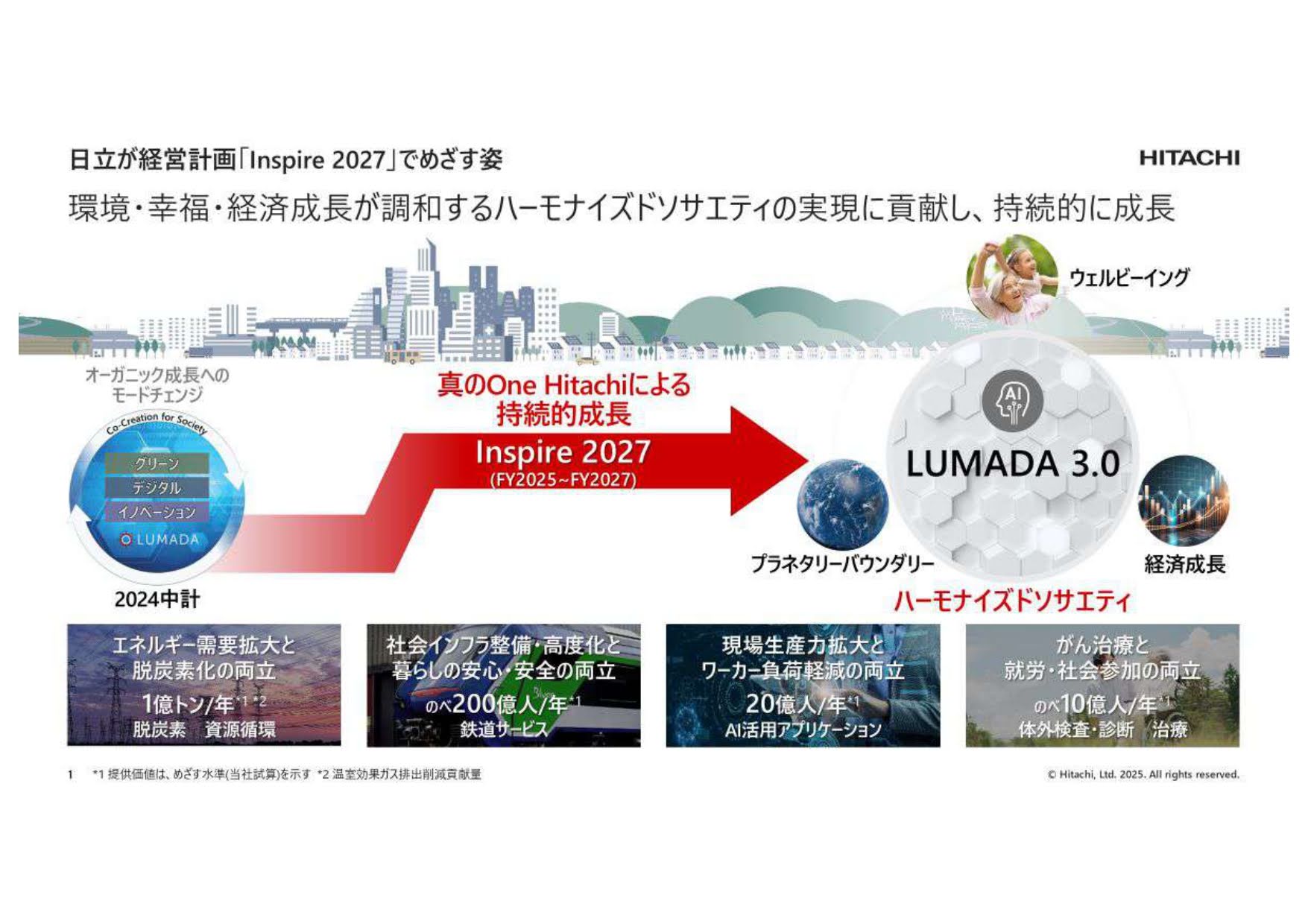 今年4月に発表された新経営計画「Inspire 2027」において、日立はこれから目指すべき世界観を示しました。「ウェルビーイング」「プラネタリーバウンダリー」、そして「経済成長」。これらが調和する「ハーモナイズドソサエティ」の実現に貢献し、持続的に成長していくことを掲げています。通常であれば3ヵ年の中期経営計画でお話しするところですが、今回はより先の未来を見据え、そこへ向かう姿勢を打ち出しました。