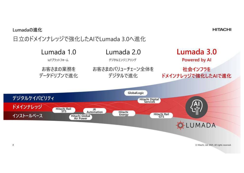 「Lumada」という言葉は耳にされたことがあるかもしれませんが、その内容は「3.0」まで進化しています。最初は2016年に「IoTプラットフォーム(Lumada 1.0)」として発表しました。その後、2021年のGlobalLogic買収などを経て、デジタルエンジニアリングをグローバル全体へ広げる「Lumada 2.0」へと進化しました。