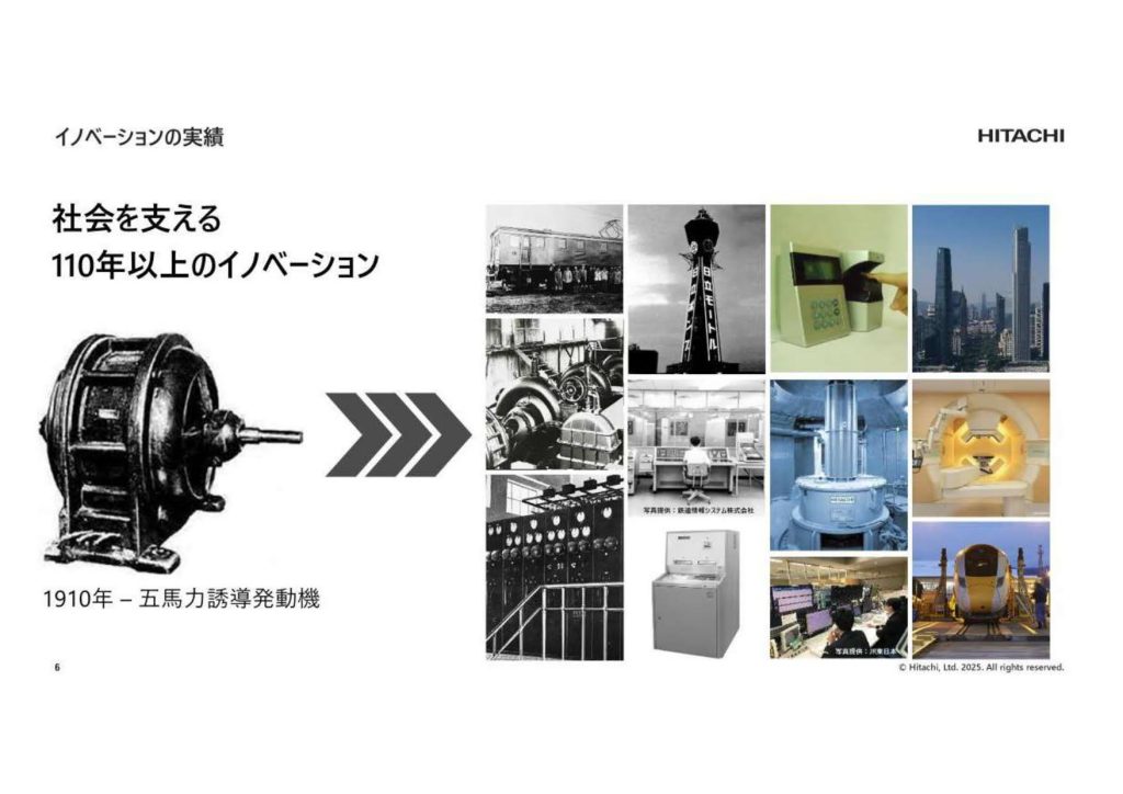 ここで少し歴史を振り返らせてください。日立は1910年に創業し、最初の製品は「5馬力誘導電動機」というモーターでした。その後、1960年代には新幹線の座席予約システム「マルス」といったITシステムを開発し、さらに運行管理システムのような制御技術(OT:Operational Technology)へと領域を広げてきました。