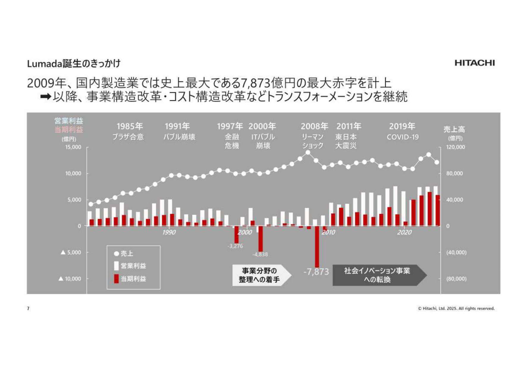 しかし、順風満帆だったわけではありません。実は2009年(2008年度決算)、リーマンショックの影響もあり、日立は国内製造業で過去最大となる7,873億円の最終赤字を計上しました。「会社が潰れるかもしれない」という危機感の中、当時の経営陣は大改革を行いました。