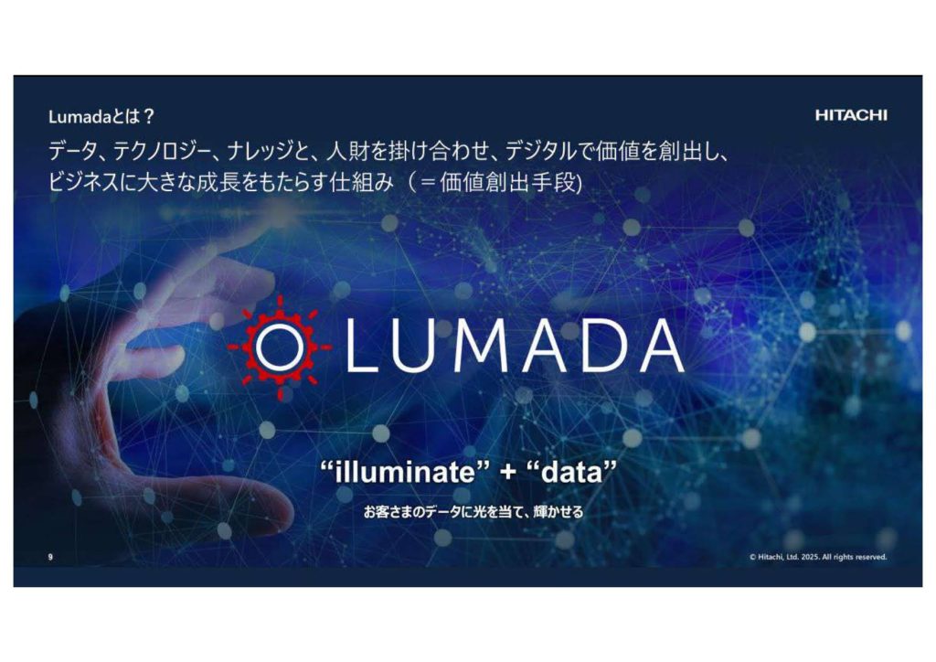Lumadaとは、「データ、テクノロジー、ナレッジと人財を掛け合わせ、デジタルで価値を創出し、ビジネスに大きな成長をもたらす仕組み」です。単なるIoTプラットフォームではなく、お客様のデータに光を当て(illuminate + data)、輝かせるための活動そのものを指します。