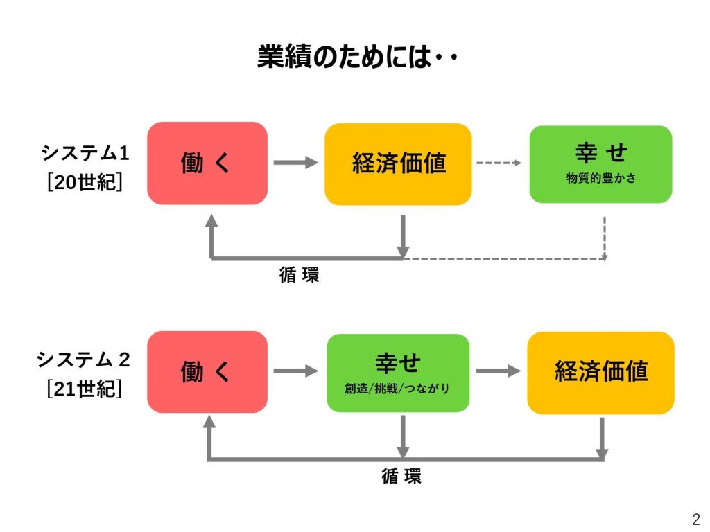 そこで、もう一つの考え方があります。システム2、「21世紀の循環」です。働くという場を通して、人は自分の役割や居場所を見つけ、そこでさまざまな工夫や挑戦をします。それを通して自分なりの創造(クリエーション)が生まれ、これがやりがいや充実感といった「幸せ」につながります。そして、そこで行った工夫や挑戦が、新たな利益の源泉になっていくのです。