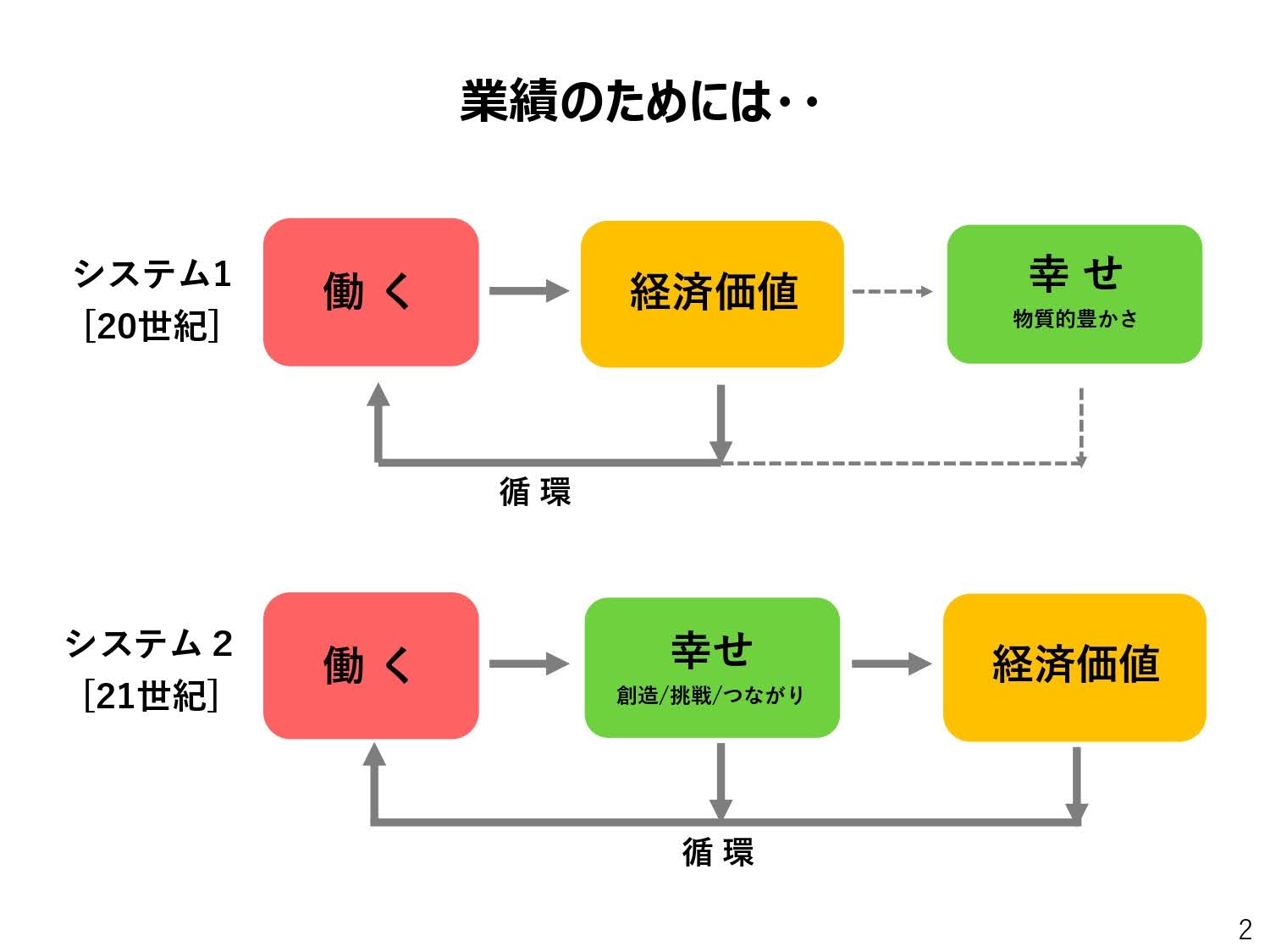 私たちはこれまで、システム1、すなわち「20世紀の循環」で考えてきました。一生懸命働いて利益を出し、国としてはGDPが上がり、その結果として世の中が豊かになって「幸せ」になる、という考え方です。