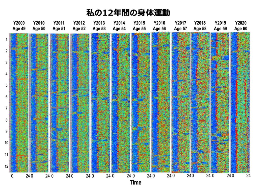 私自身も、この左腕に加速度センサーを装着し、2009年から2020年までの12年間、24時間365日の身体運動をすべて1枚の図(データ)にまとめました。
