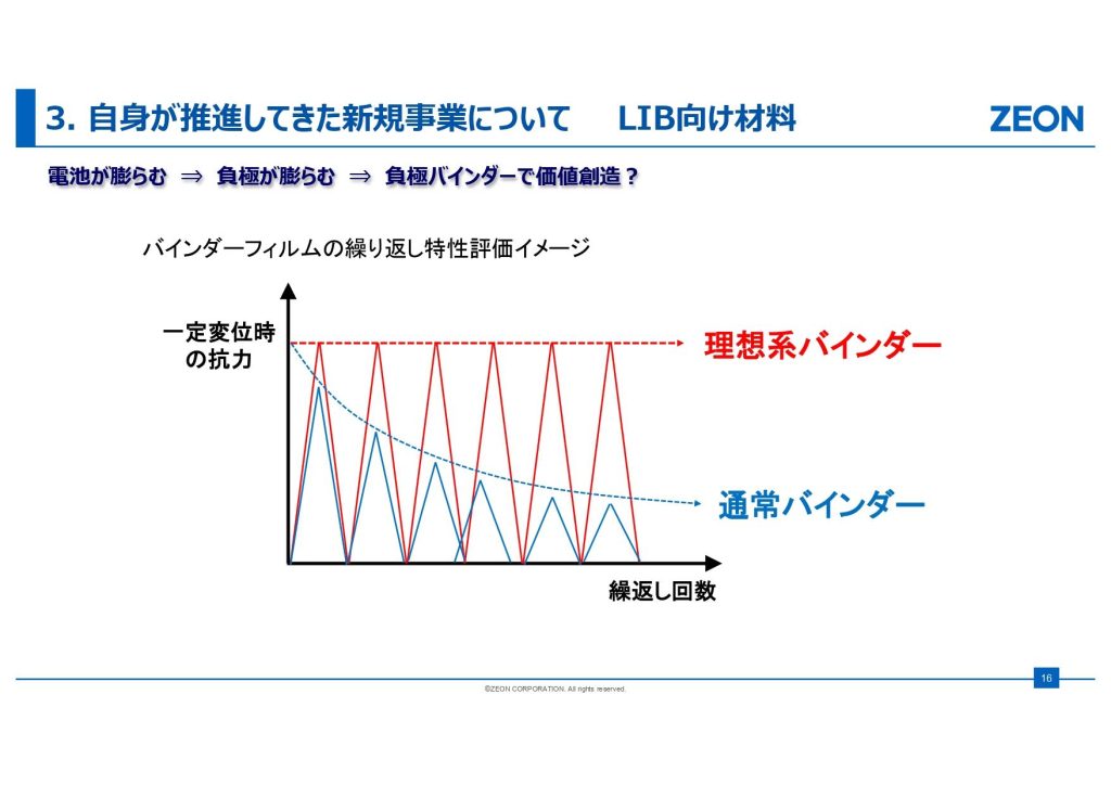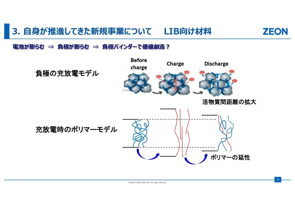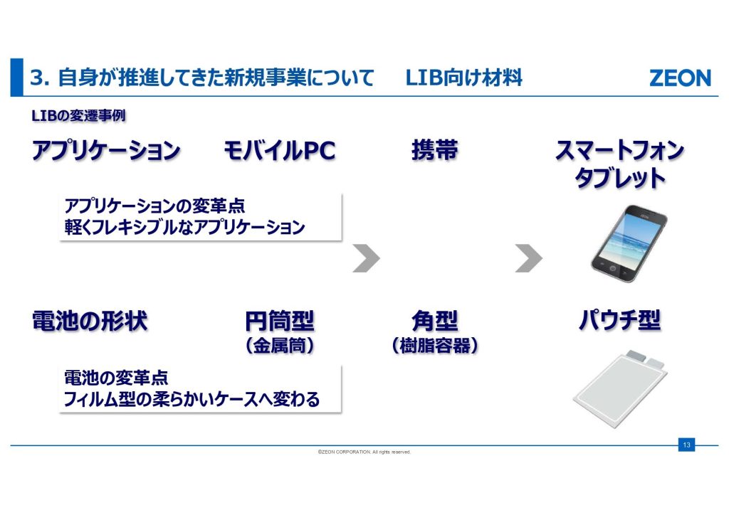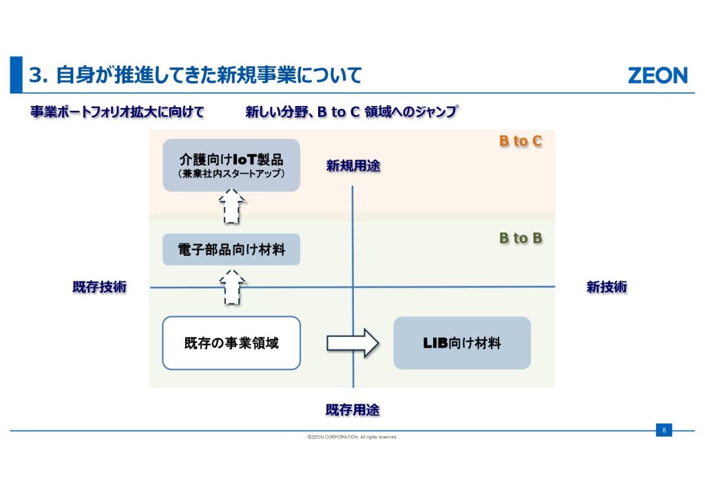 本日は、私が推進してきた事業の中から、事業ポートフォリオを拡大する上で重要な役割を果たした2つの事例についてお話しします。1つは新しい技術で既存の用途に応える「LIB(リチウムイオン二次電池)向け材料」、もう1つは既存技術を応用し、BtoCという全く新しい用途に挑戦する「介護向けIoT製品」です。