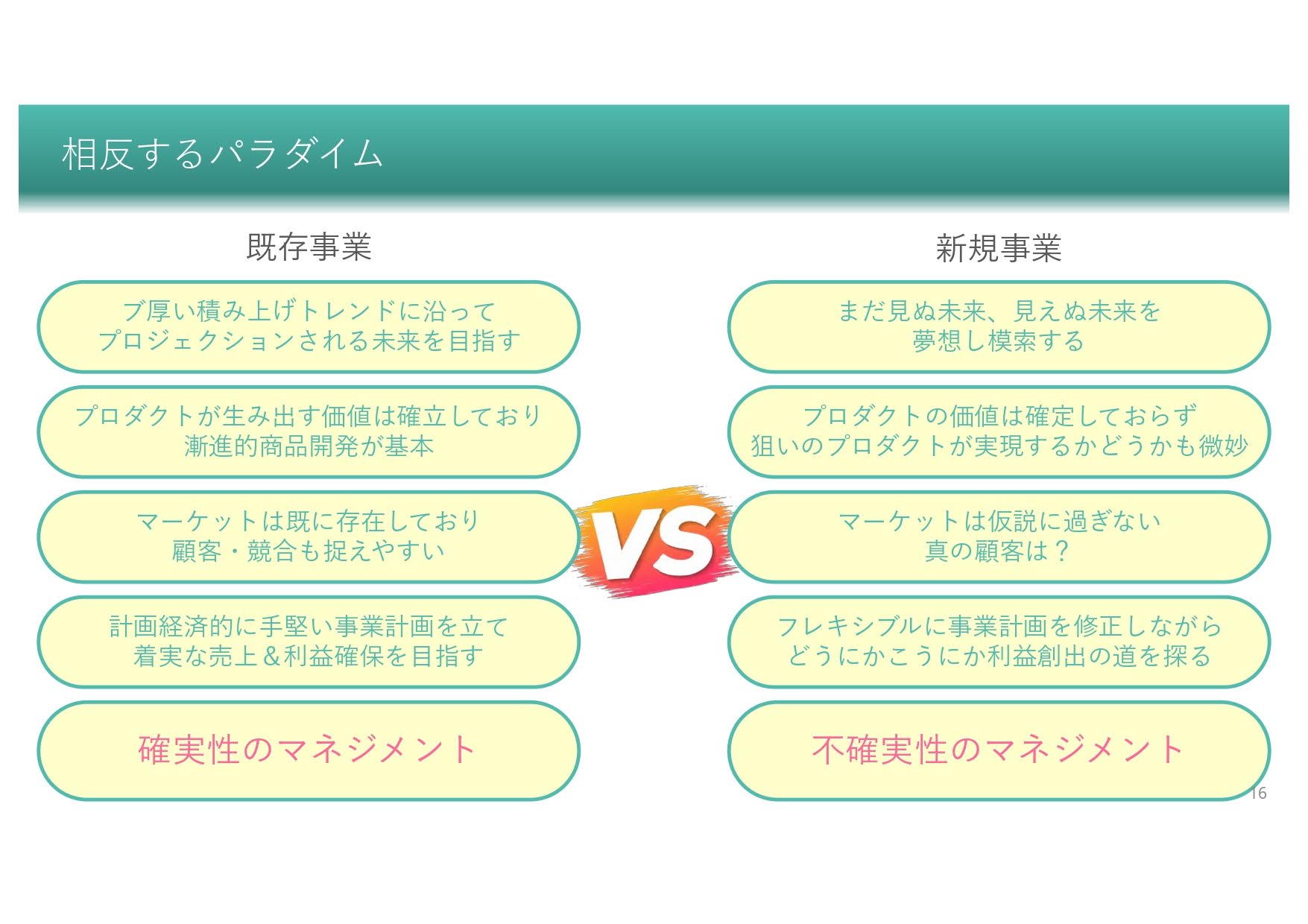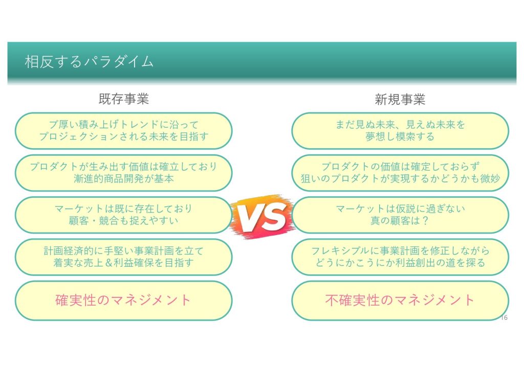 既存事業は、積み上げられた過去のトレンドに沿って未来を投影する「確実性のマネジメント」の世界です。プロダクトの価値もマーケットもすでに確立されており、計画経済的に着実な利益確保が求められます。一方で新規事業は、見えない未来を夢想する「不確実性のマネジメント」です。プロダクトが実現するかどうか、真の顧客が誰なのかも分からない中で、柔軟に計画を修正し続けなければなりません。
