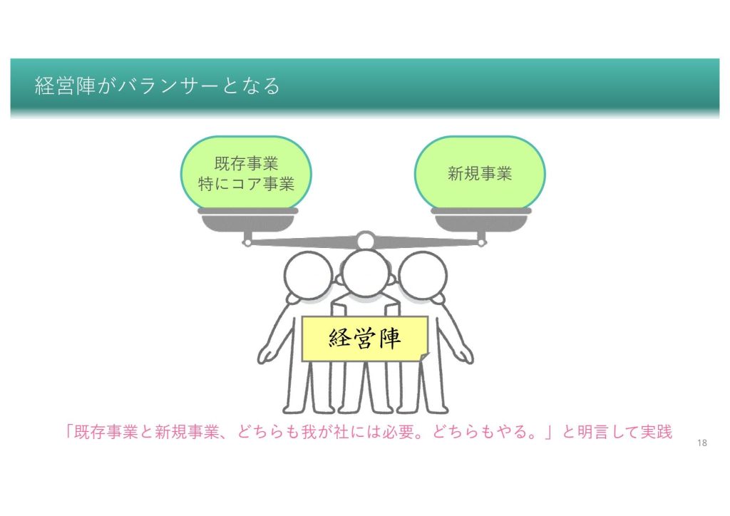 既存事業と新規事業の対立を解消し、両者のバランスを取るための唯一の「バランサー」は経営陣です。