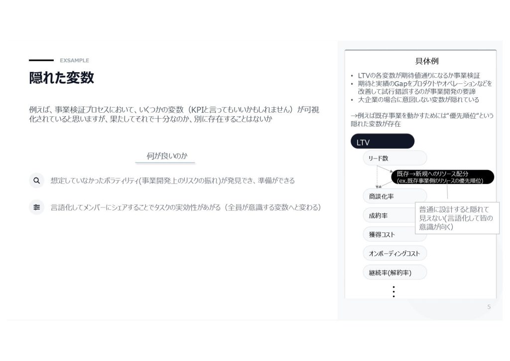 スタートアップであればシンプルな意思決定で済むことも、大企業では職種やテーマを問わず、多種多様な問題を同時に解いていかなければなりません。いわゆる「社内政治」「組織の壁」「ハレーション」といった状態は、捉え方を変えれば、事業開発において考慮すべきパラメーター、つまり「変数」が非常に多い状態と言い換えることができます。