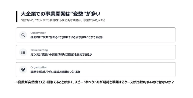 大企業で事業開発を進めようとすると、多くの方が「なかなか進まない」「やりにくい」という感覚を持たれるのではないでしょうか。この構造的な問題の正体は、大企業特有の「変数の多さ」にあると私は考えています。