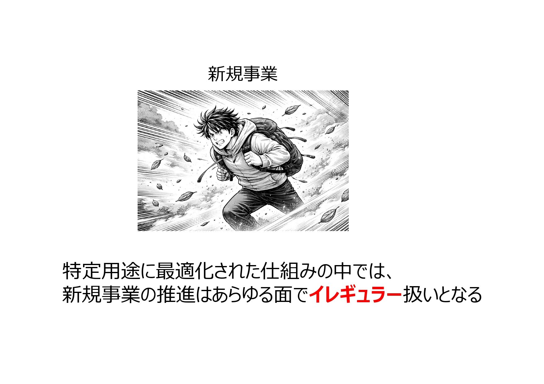 そこに新規事業を持ち込むということは、組織にとって「イレギュラー」でしかありません。本来、効率を追求する仕組みの中で、不確実な新しいことをやろうとすれば、あらゆる面で摩擦が生じるのは当然のことなのです。