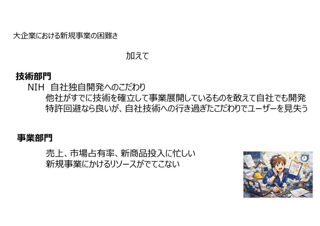 一方で事業部門は、日々の売上やシェア、新商品投入に忙殺されており、新規事業に割くリソースなどほとんどありません。こうした「組織の最適化」と「自前主義」が二重の壁となり、多くのアイデアが「死の谷」へと消えていきます。これが大企業における新規事業の厳しい現実なのです。
