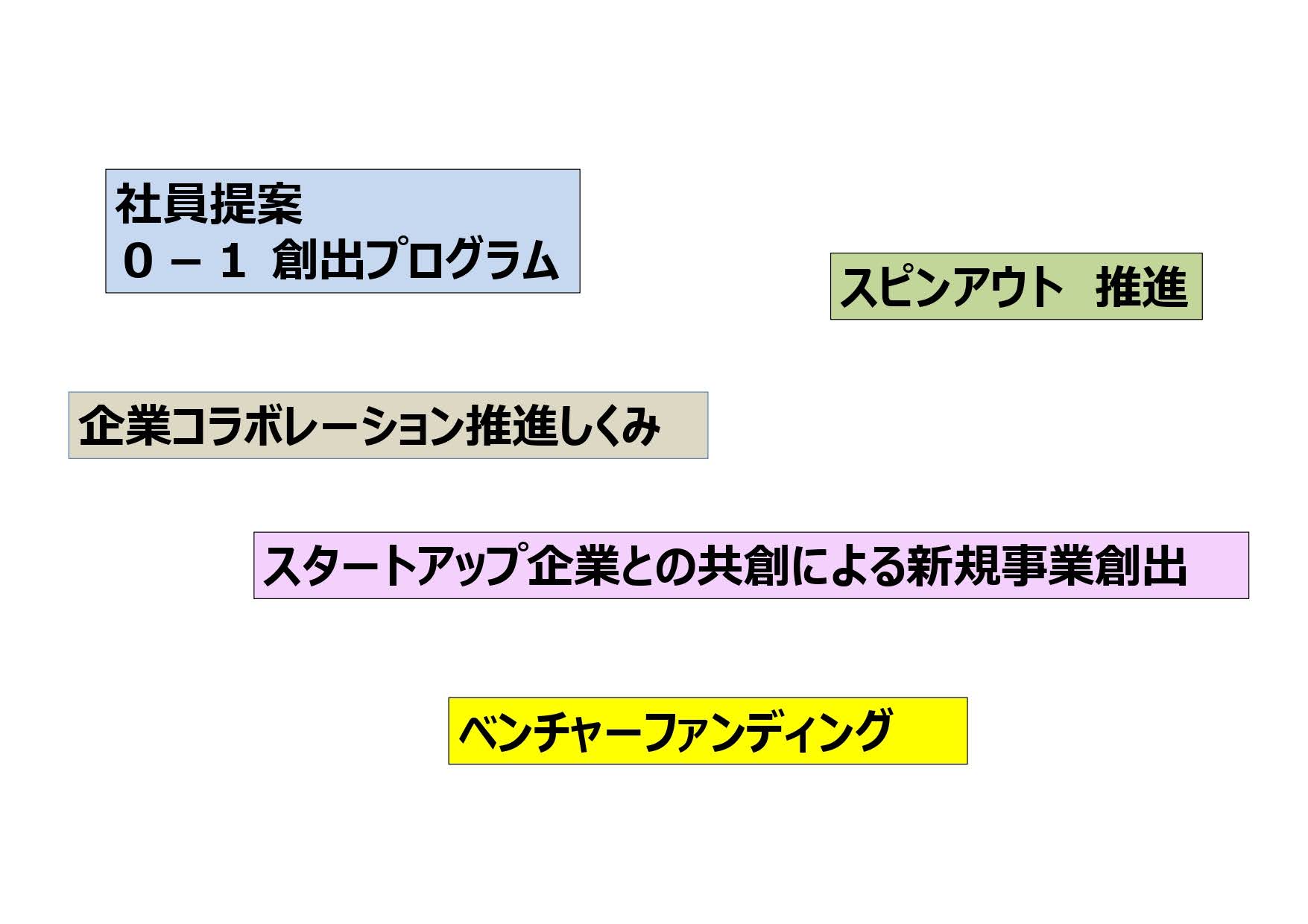 大きく分けて、社員提案による「0-1」創出、企業同士のコラボレーション、スタートアップとの共創、スピンの推進、そしてベンチャー投資という5つの柱がありました。