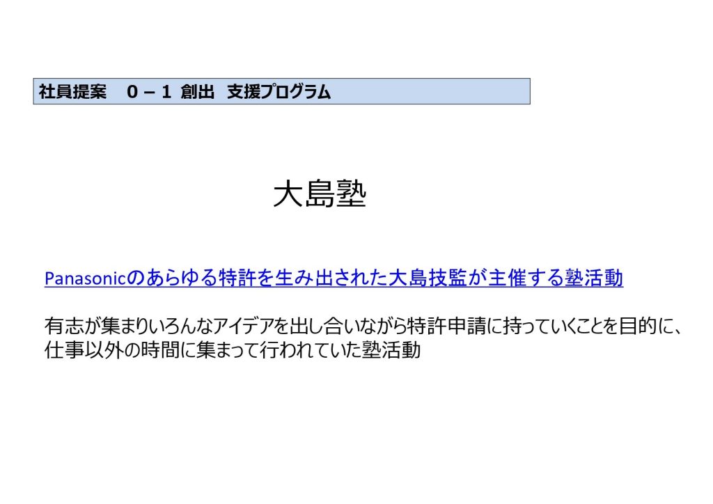 例えば「大島塾」です。これはデジタル放送などの標準規格で数多くの特許を生み出した大島技監が主催していた活動です。業務外の時間に有志が集まり、自由なアイデアを特許や事業へと昇華させる場でした。ここからは、会社を辞めて自ら起業し、事業を大きく伸ばしたメンバーも出ています。