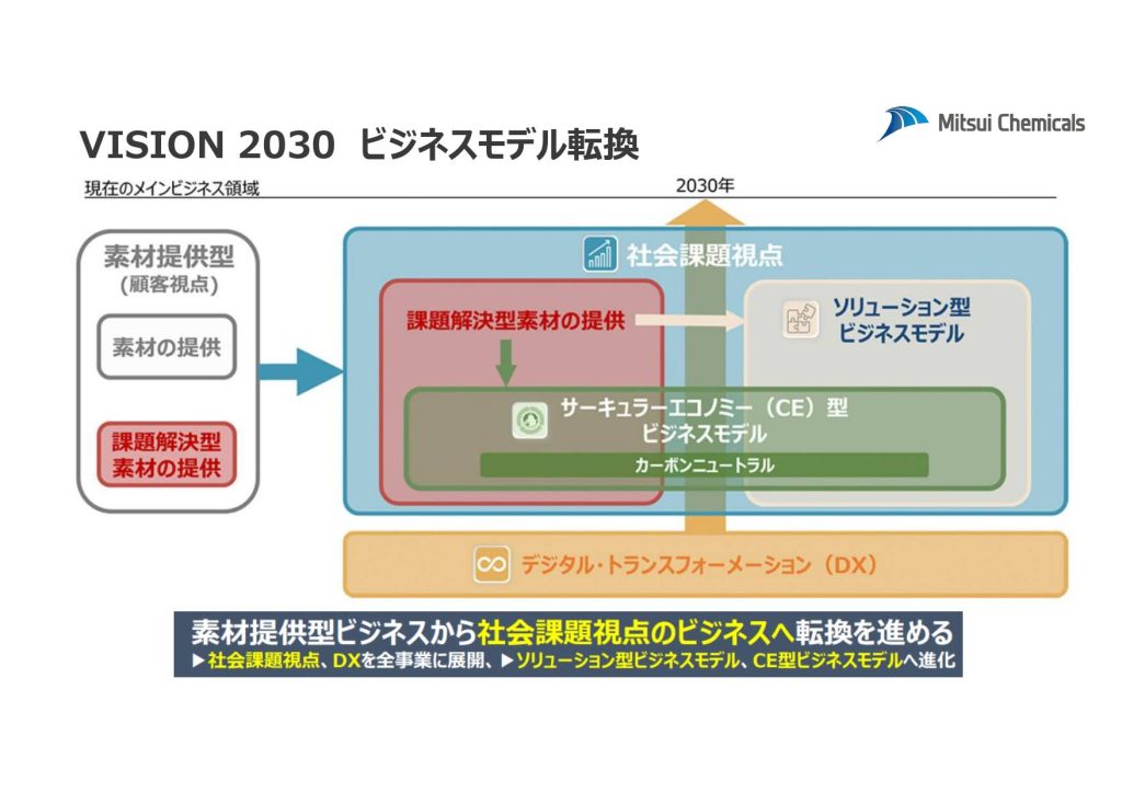 三井化学では現在、長期経営計画「VISION 2030」を掲げています。これは2030年をターゲットとしたビジネスモデル転換の道しるべです。これまでの私たちは「素材提供型ビジネス」が中心でした。しかし、これからの時代は「社会課題視点のビジネス」への転換が不可欠です。単に素材を提供するだけでなく、顧客の困りごとを解決する「ソリューション型ビジネスモデル」、そして化学会社としての責務である「サーキュラーエコノミー(CE)型ビジネスモデル」へと進化させていく必要があります。当然、デジタル(DX)の活用も大前提となります。社内の生産性向上だけでなく、お客様へ新たな価値を提供するためのDXを全事業で展開していくことを目指しています。
