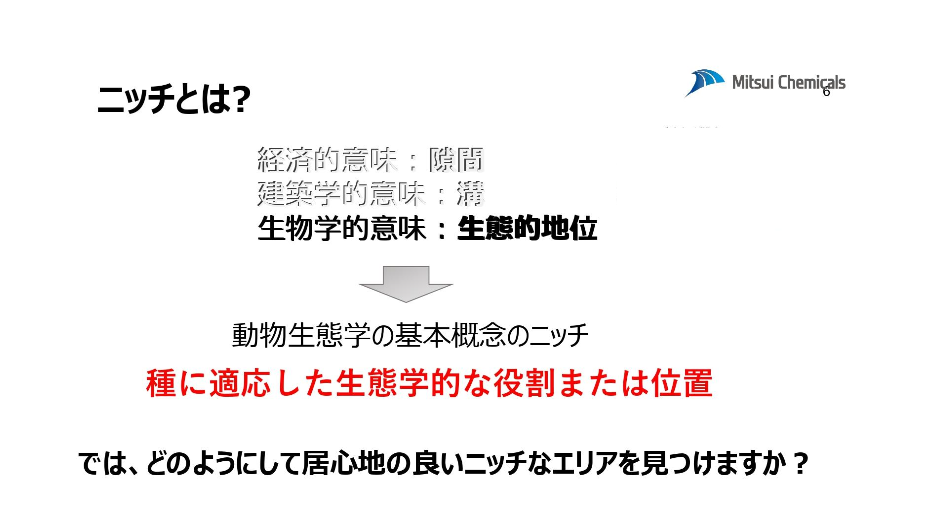成長領域において、私たちはどう戦っていくべきでしょうか。私が前職時代から重視しているのが「グローバルニッチトップ」という考え方です。ここで言う「ニッチ」とは、一般的にイメージされるような「隙間」や「小規模」という意味ではありません。私が考えるニッチとは、生物学的な意味での「生態的地位(Niche)」です。ある生態系(エコシステム)の中で、「この種がいなければ生態系全体が崩れてしまう」という不可欠なポジションのことを指します。ステークホルダーから「三井化学には必ずここにいてほしい」と言われるような安住の地を確保すること。これこそが真のニッチ戦略です。