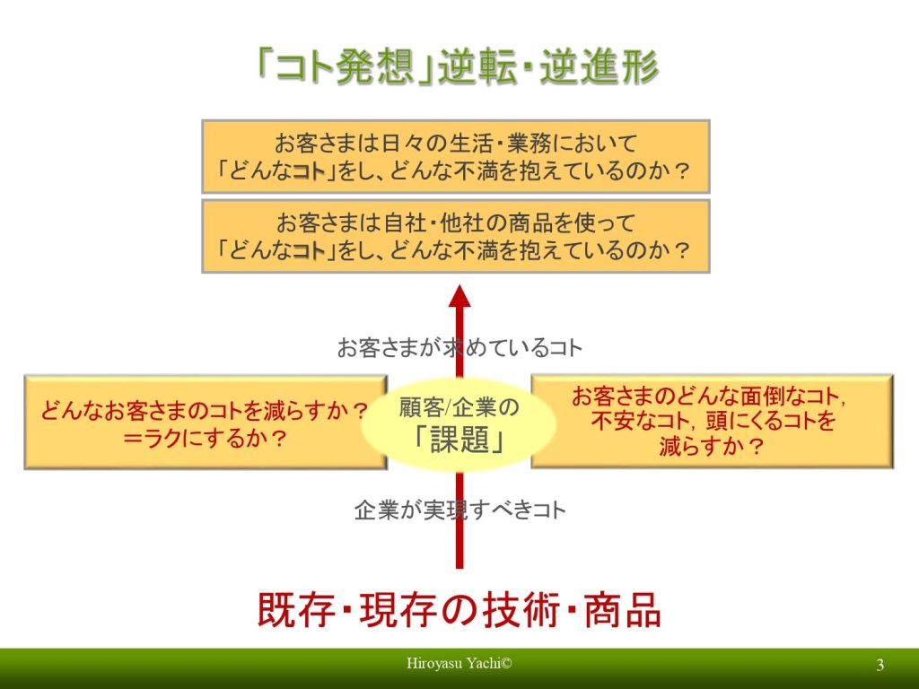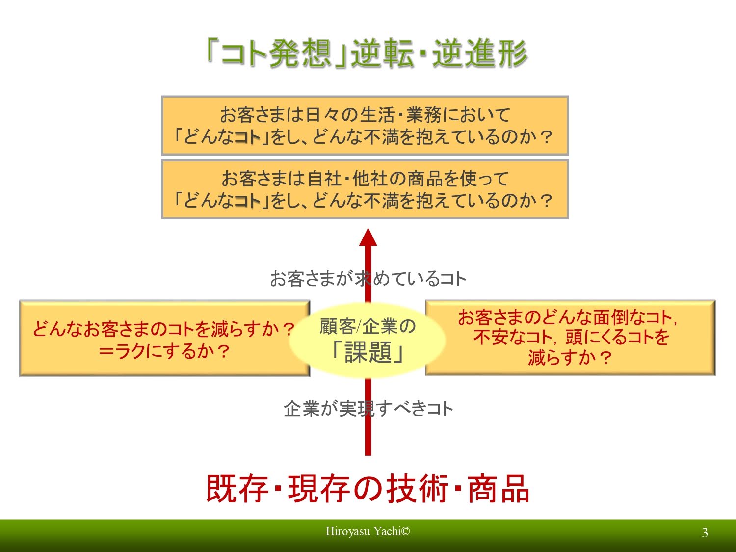 手段がすでにあって、そこから別の目的を考える。この困難な課題に取り組むために、「コト発想」の逆転形・逆進形が有効となります。